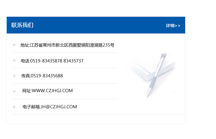 地址:常州市新北區友邦商務大廈1幢16、17層  電話:0519-85101652  傳真:0519-85112595  郵編:213022  網址:www.cz-jiayue_cn.xianshuangying.com  郵箱:xiajifengaa@163.com